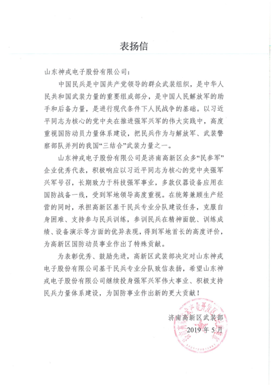 神戎電子獲得濟南高新區(qū)武裝部致信表揚