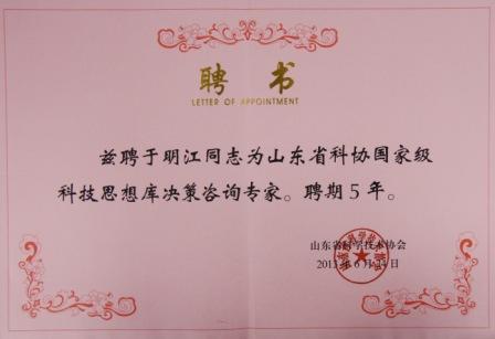 于明江董事長入選山東省科協國家級科技思想庫決策咨詢專家
