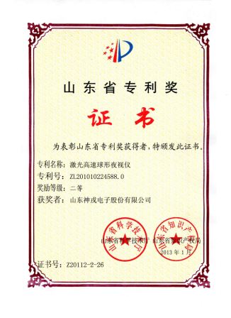 激光高速球形夜視儀發(fā)明專利榮獲第十三屆山東省專利“二等獎”