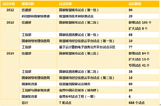 我國住建部、發改委、工信部等重要部門均參與智慧城市試點規劃,截至2015年共規劃了686個試點城市,試點城市將經過3-5年的創建期,住建部將組織評估,對評估通過的試點城市(區、鎮)進行評定,評定等級由低到高分為一星、二星和三星,由此促進產業快速發展。